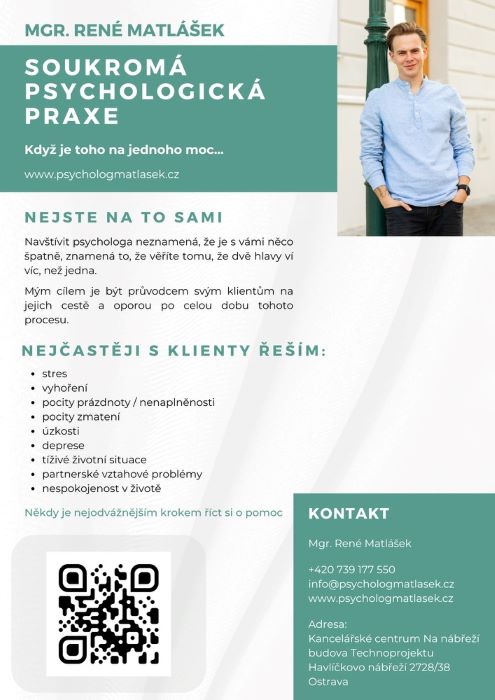 V Ostravě od 1. 12. 2024 otevírá Mgr. René Matlášek novou soukromou psychologickou ordinaci. Nabízí pomoc novým klientům. Víc informací najdete