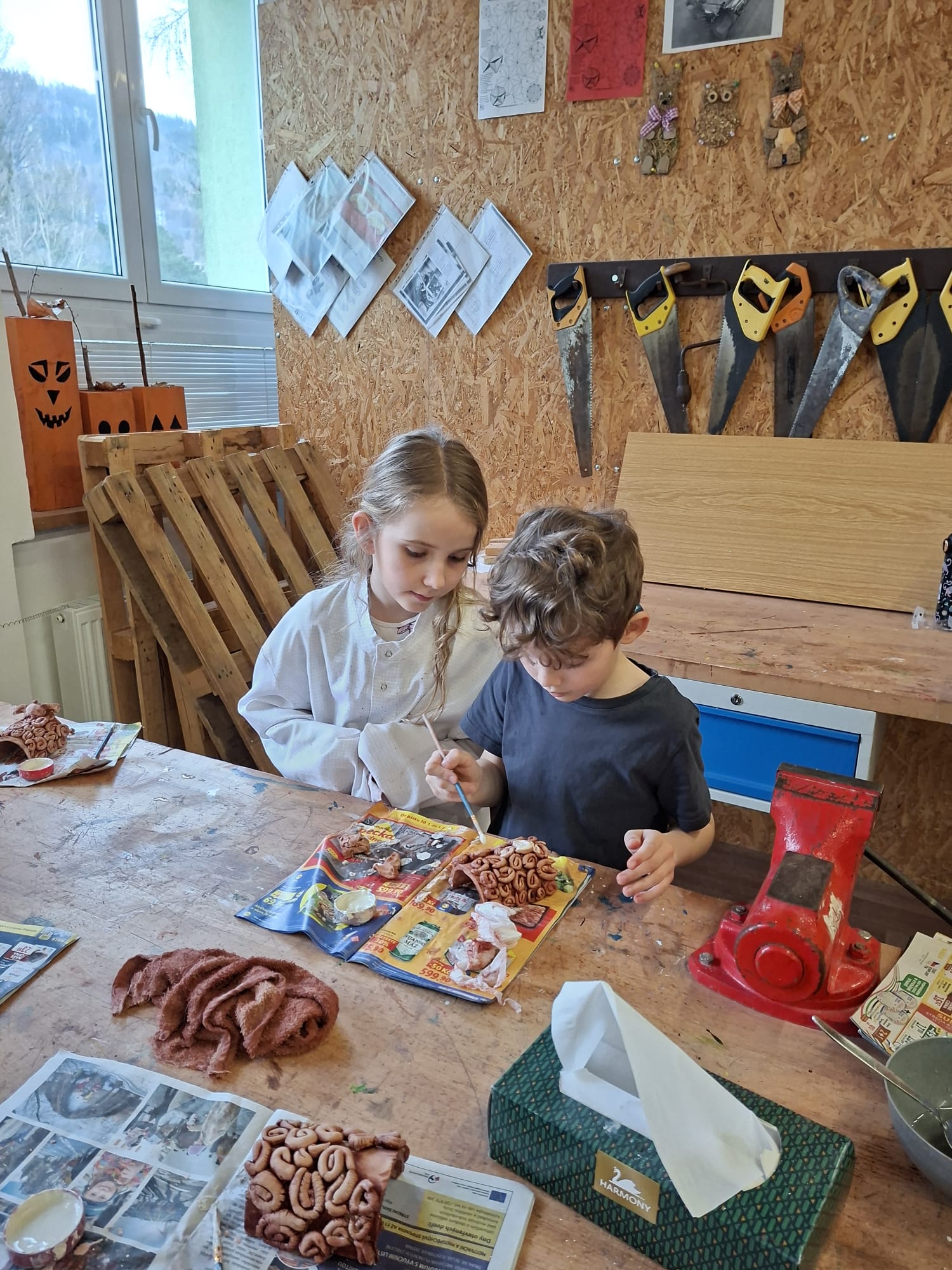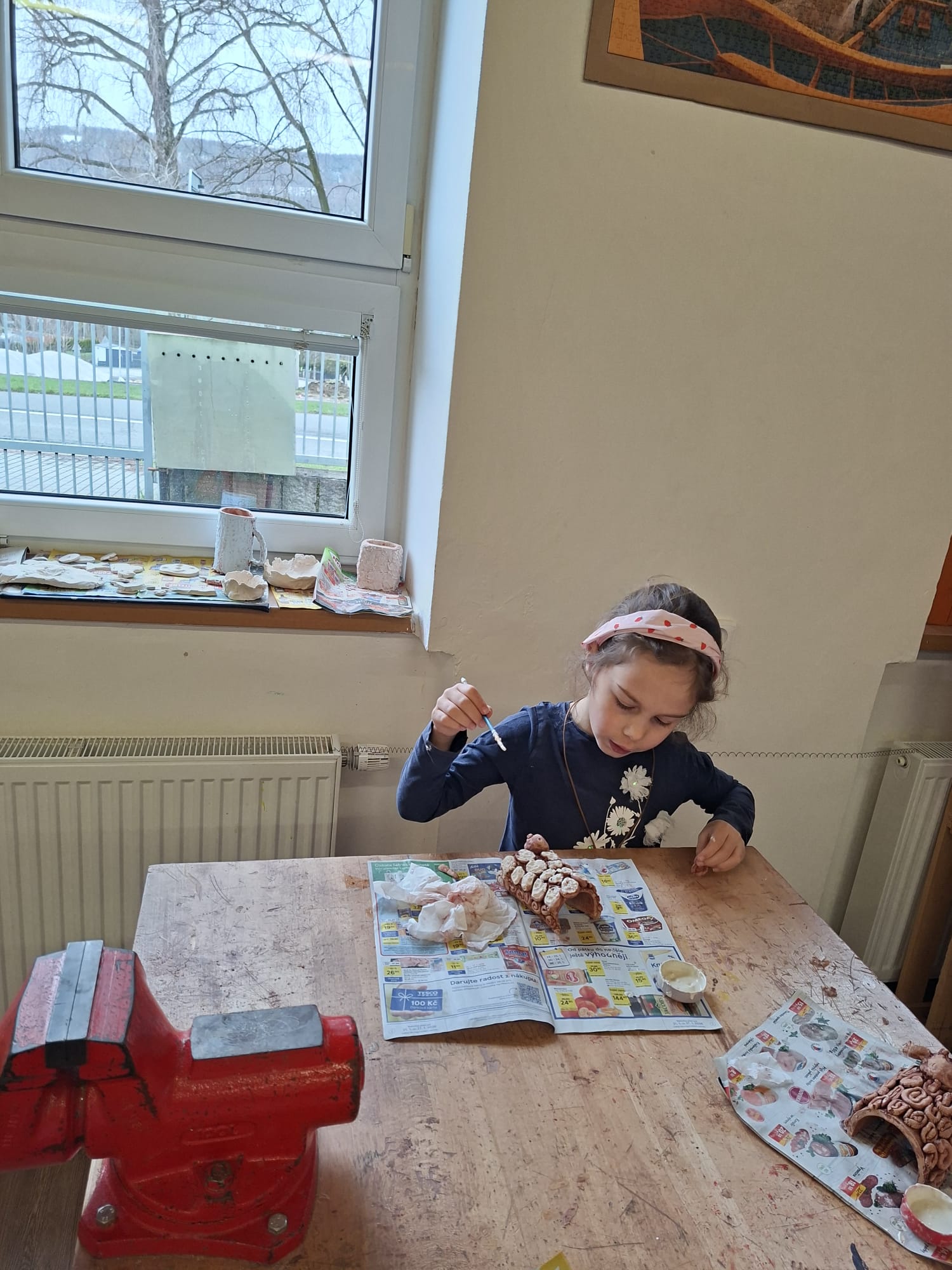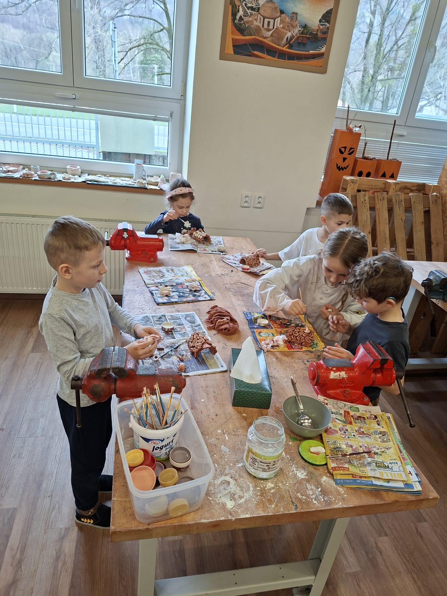 Pro většinu z nich byla práce s hlínou novou zkušeností – děti modelovaly, zkoušely různé tvary, přidávaly detaily a s velkým zaujetím dotvářely každý kousek. Bylo krásné sledovat jejich soustředění, radost i to, jak si navzájem ukazují své nápady.