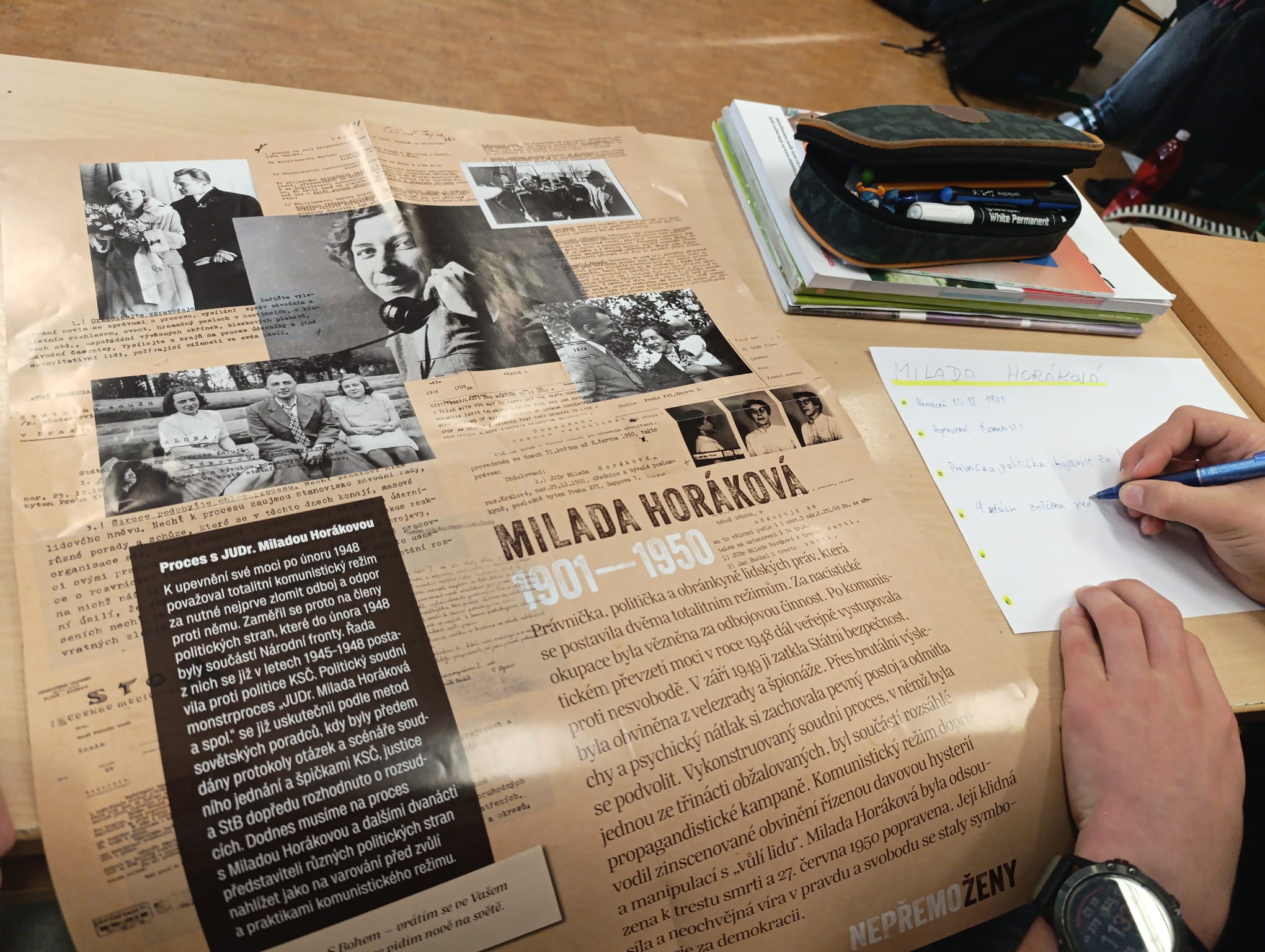 Po projekci přišla na řadu reflexe – vyjádření emocí a sdílení svých pocitů prostřednictvím metody dopis/R.A.F.T. Na závěr žáci vytvořili trojice, ve kterých měli za úkol prostudovat plakátovou výstavu NepřemoŽENY, jež představuje sedm příběhů žen, statečně vzdorujících komunistickému režimu.