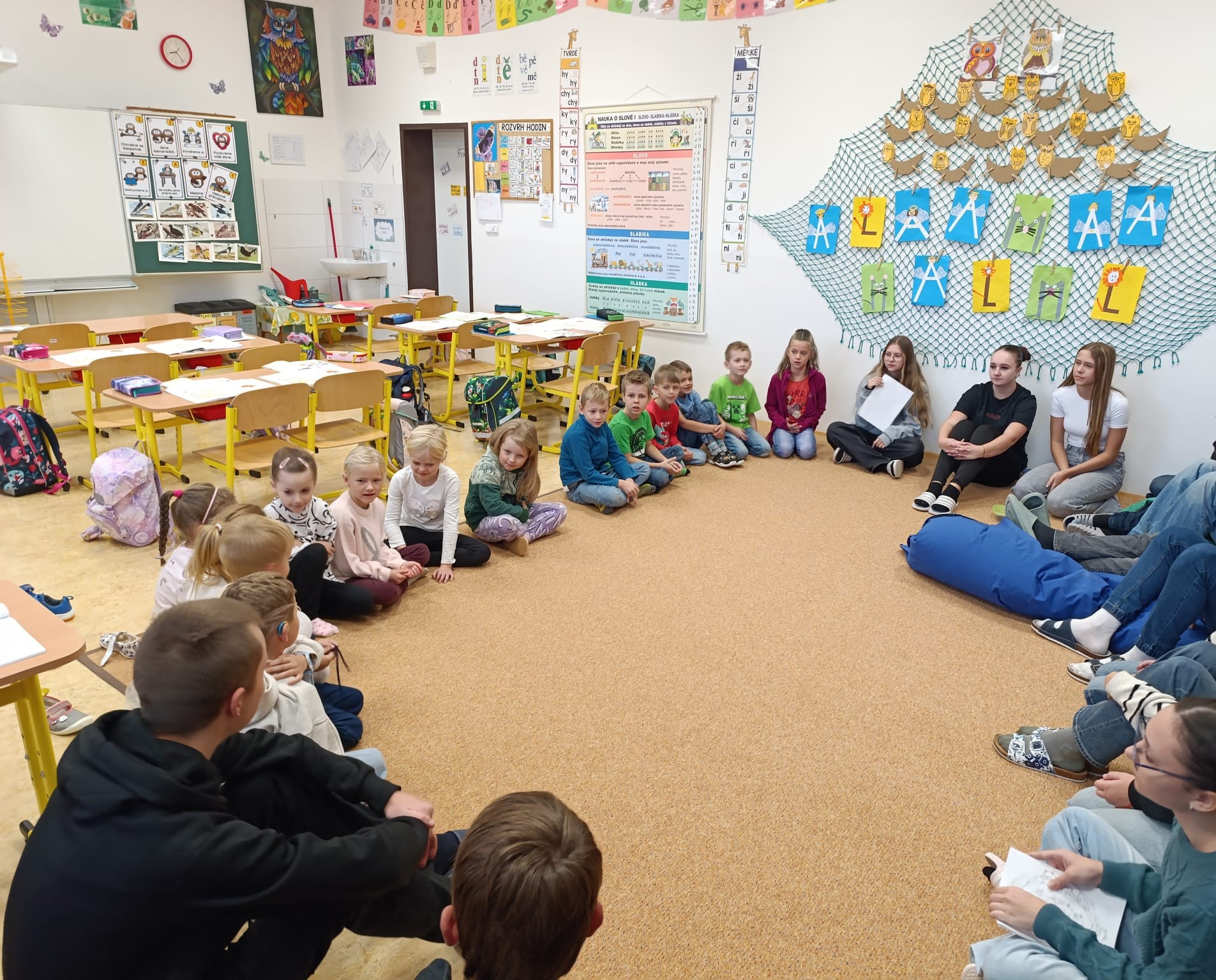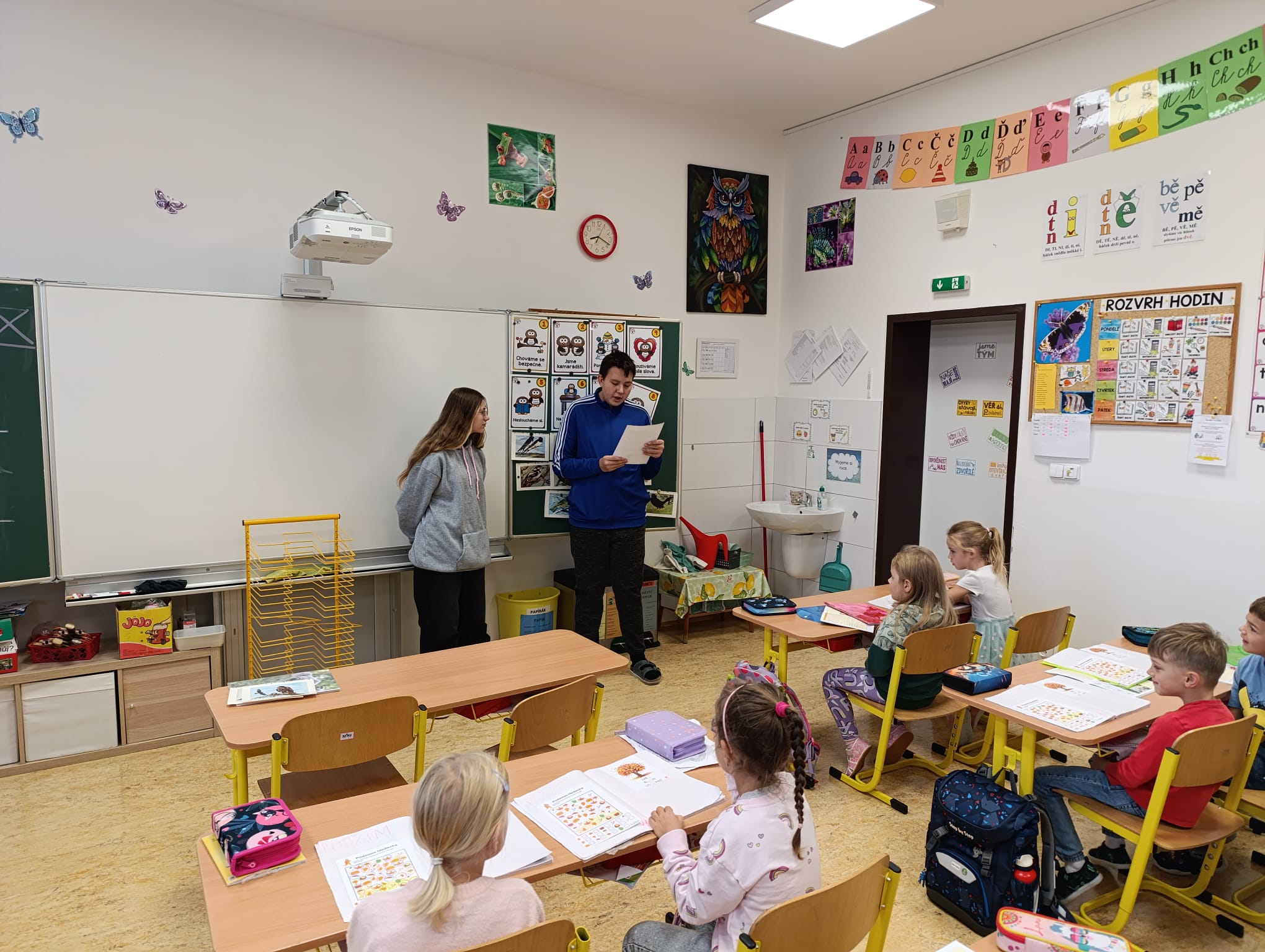 Úvodní slovo na začátku setkání pronesli žáci Eliška Šigutová a Dan Gregor, kteří prvňáčkům mimo jiné za celou třídu nabídli pomocnou ruku a možnost podpory během školního roku. Poté se žáci obou tříd vzájemně představili. Po seznámení následovala zábavná část hodiny v podobě stanovišť, která připravili žáci 9. ročníku.