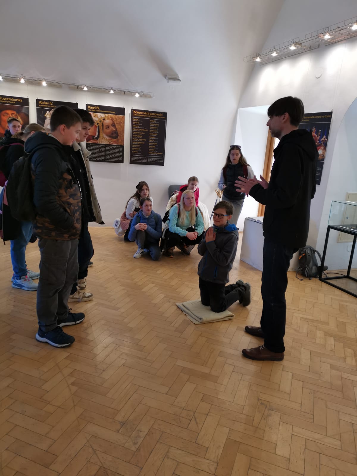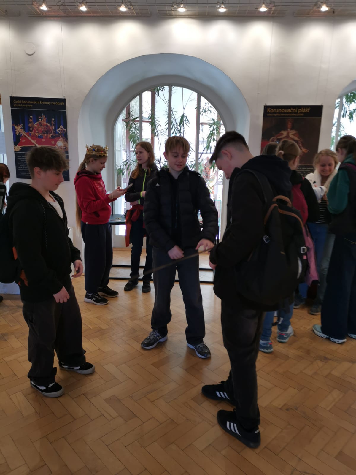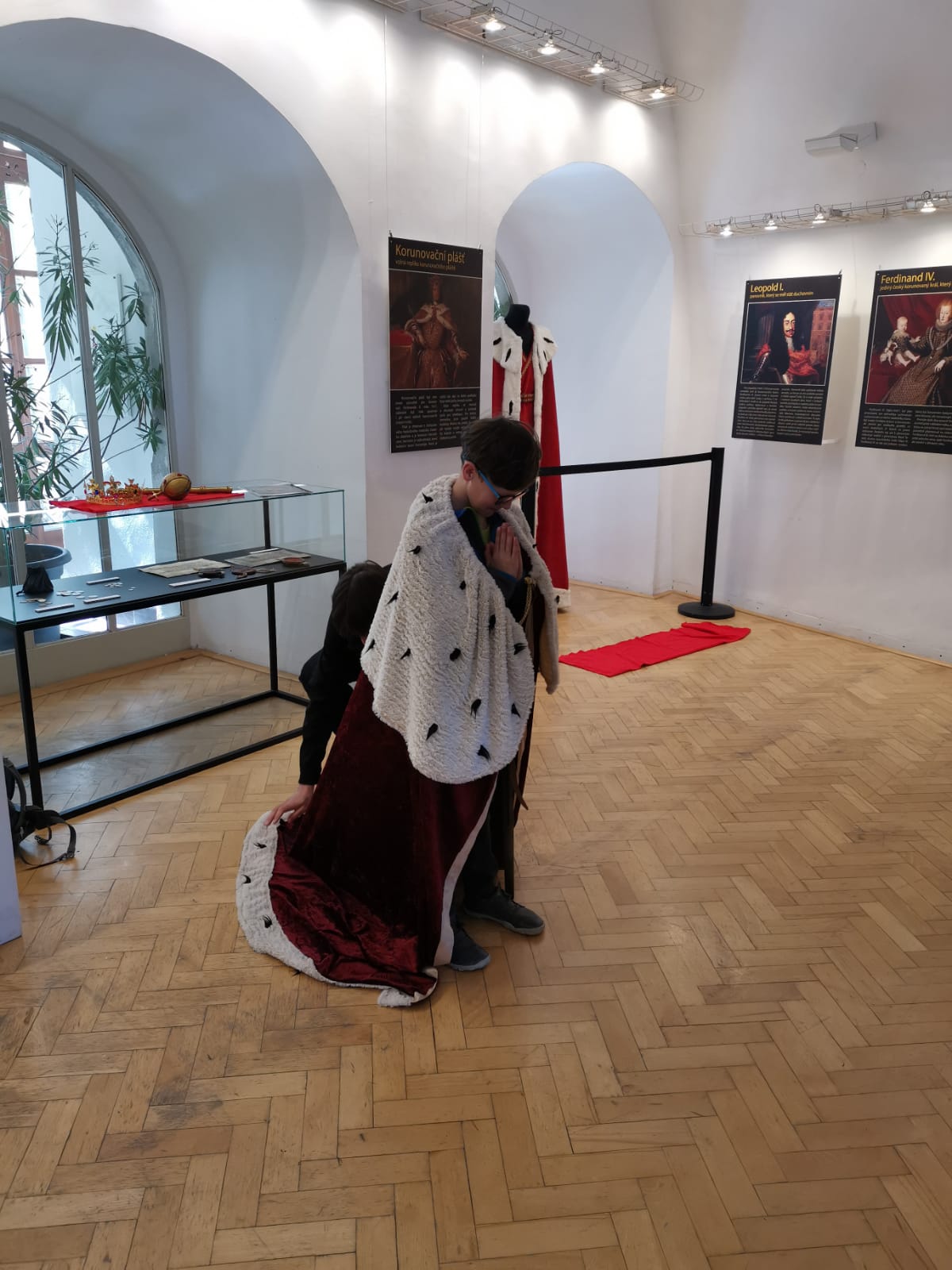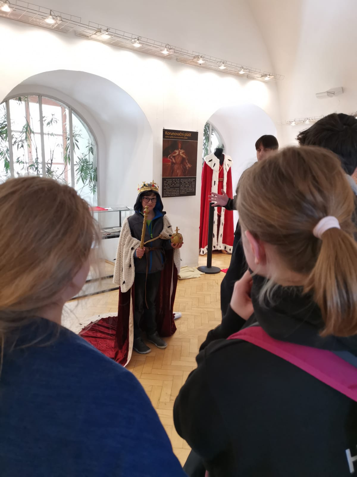 Po příjezdu jsme se rozdělili na dvě skupiny. Jedna skupina navštívila přírodovědnou expozici, kde jsme se dozvěděli mnoho zajímavostí o místní fauně a floře. Druhá skupina šla na výstavu věnovanou korunovačním klenotům. Měli jsme možnost vidět jejich věrné repliky a dozvědět se více o jejich historii a významu. Největším zážitkem byla ukázka korunovace, do které se zapojili někteří naší žáci. Díky tomu jsme si dokázali lépe představit, jak taková korunovace kdysi probíhala. Pak se obě skupiny prostřídaly.