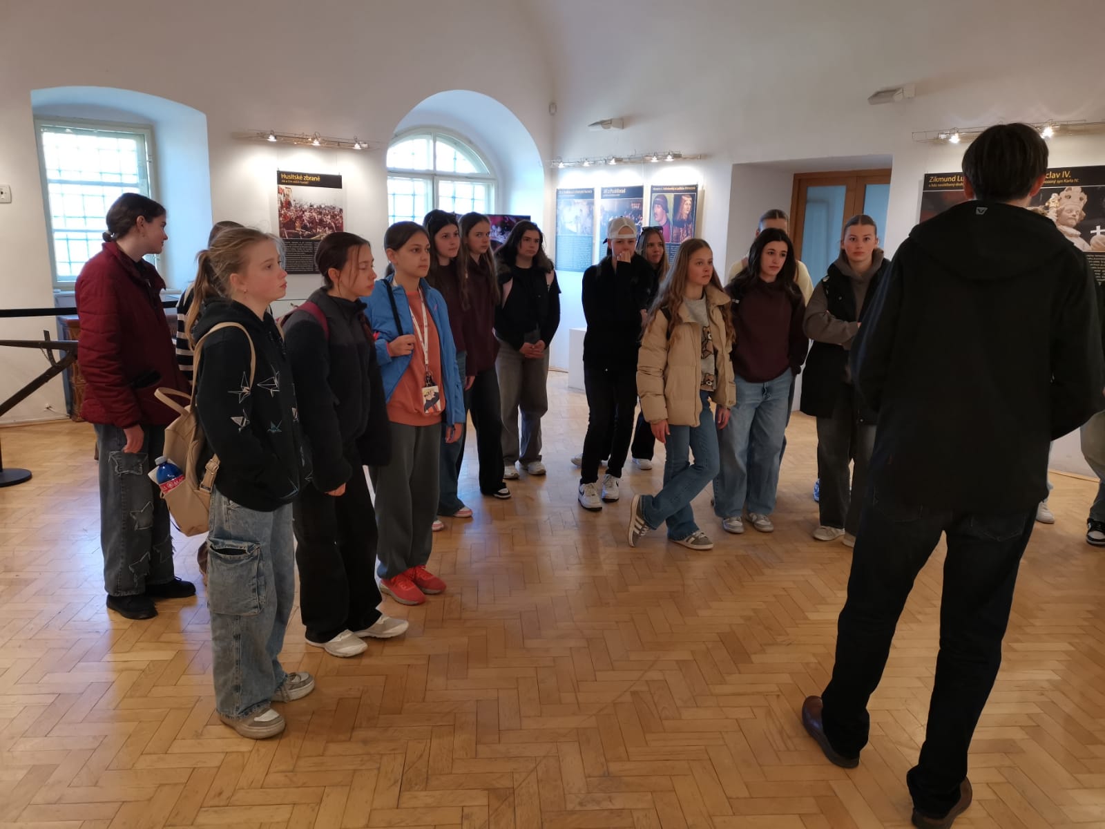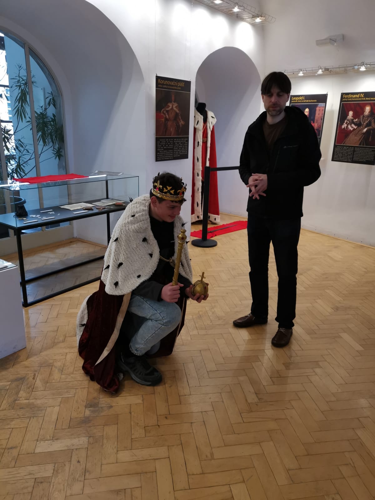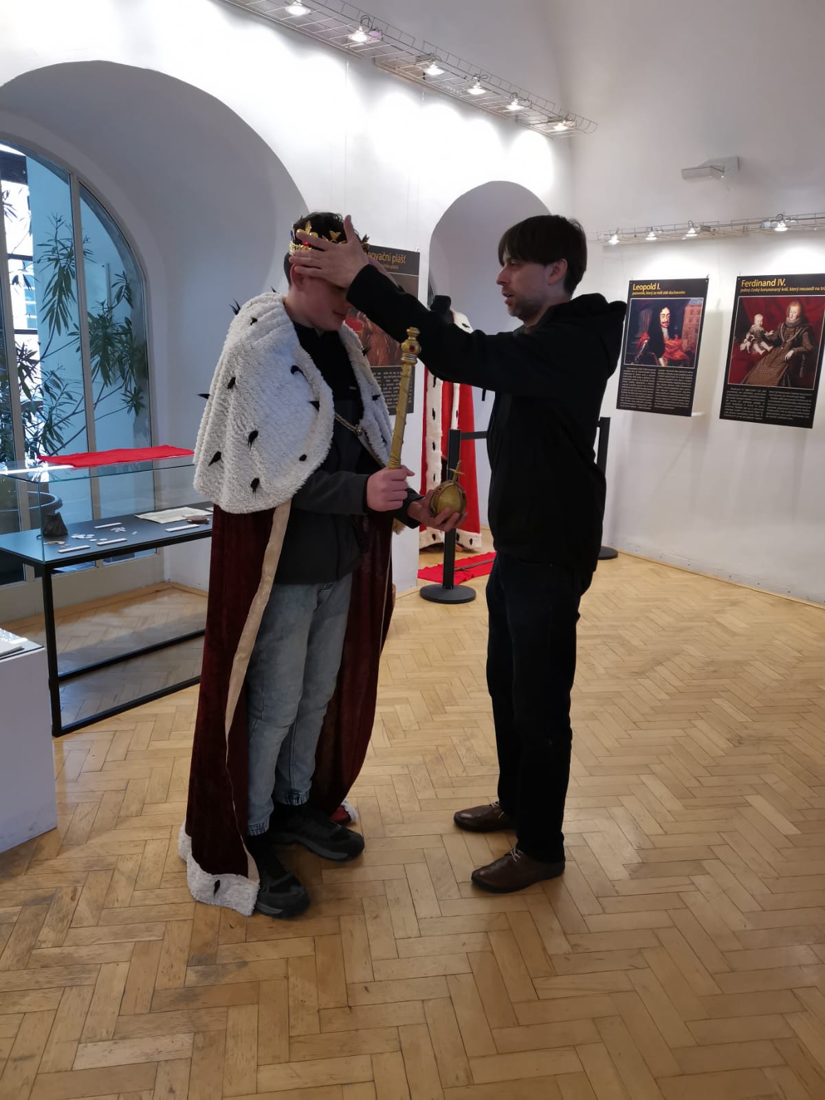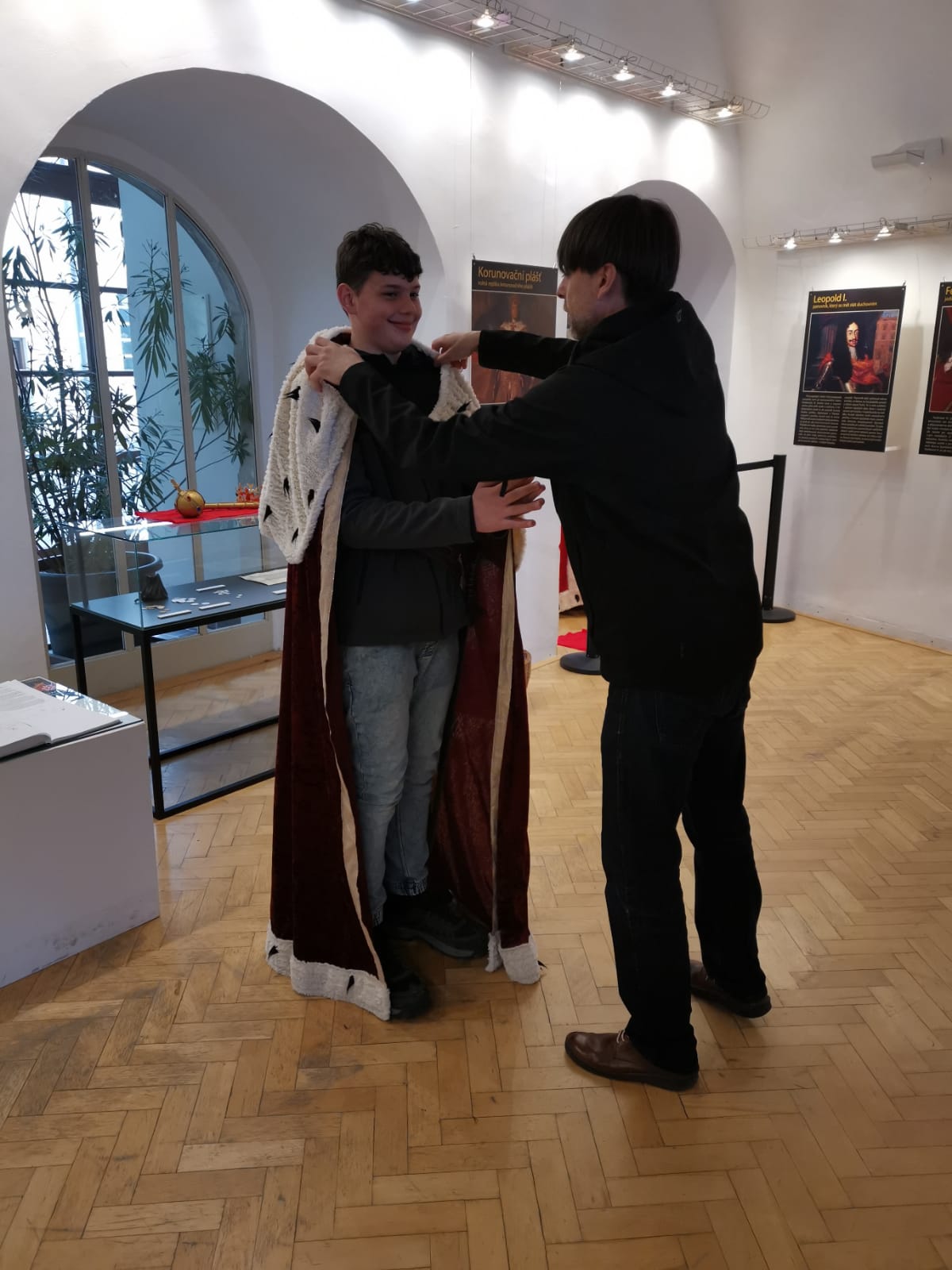 Po příjezdu jsme se rozdělili na dvě skupiny. Jedna skupina navštívila přírodovědnou expozici, kde jsme se dozvěděli mnoho zajímavostí o místní fauně a floře. Druhá skupina šla na výstavu věnovanou korunovačním klenotům. Měli jsme možnost vidět jejich věrné repliky a dozvědět se více o jejich historii a významu. Největším zážitkem byla ukázka korunovace, do které se zapojili někteří naší žáci. Díky tomu jsme si dokázali lépe představit, jak taková korunovace kdysi probíhala. Pak se obě skupiny prostřídaly.