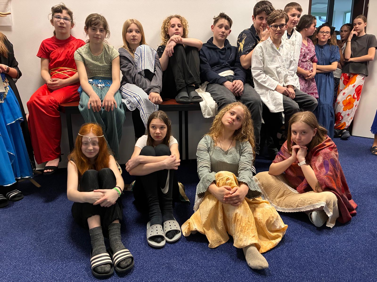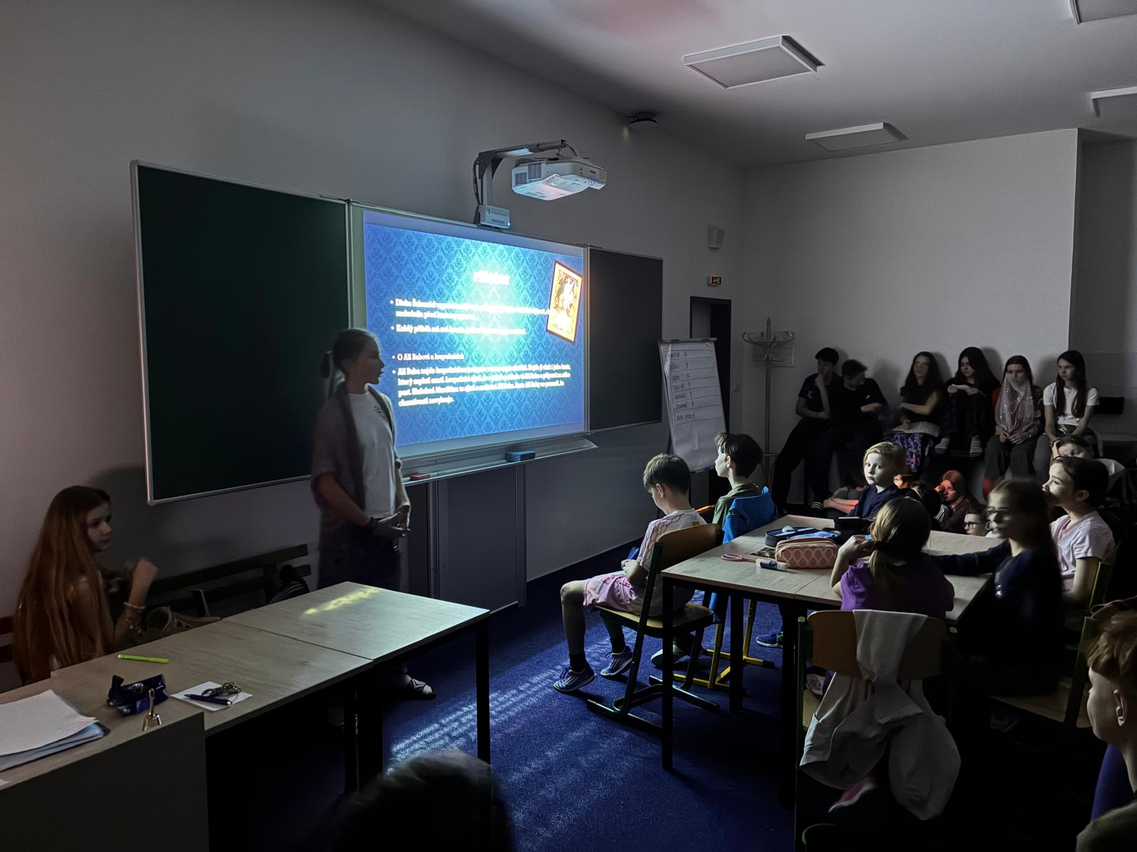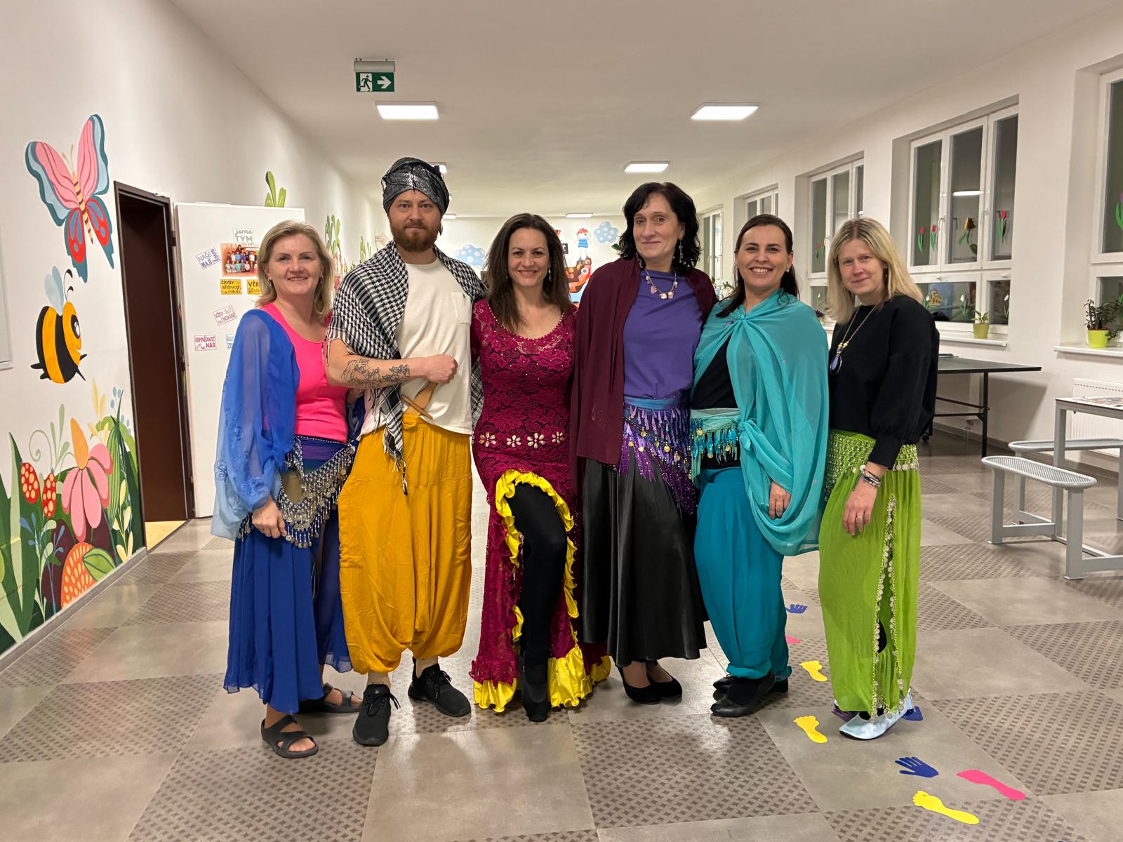 Hned po příchodu je čekalo uvítání v Modrém salonku, děti se hravou formou rozdělily do skupin, vymyslely si názvy skupinek a luštily šifru, která jim měla prozradit téma letošní Noci s Andersenem. Orientální atmosféru dokreslovaly kostýmy učitelů i pomocníků z šestých, sedmých a devátých tříd, které připomínaly postavy z příběhů o krásné Šeherezádě, Alí Babovi či Aladinovi. Hudba, dekorace i tematické úkoly navozovaly pocit, že se všichni ocitli v pohádkovém Bagdádu. Škola se na chvíli stala palácem plným dobrodružství a fantazie.