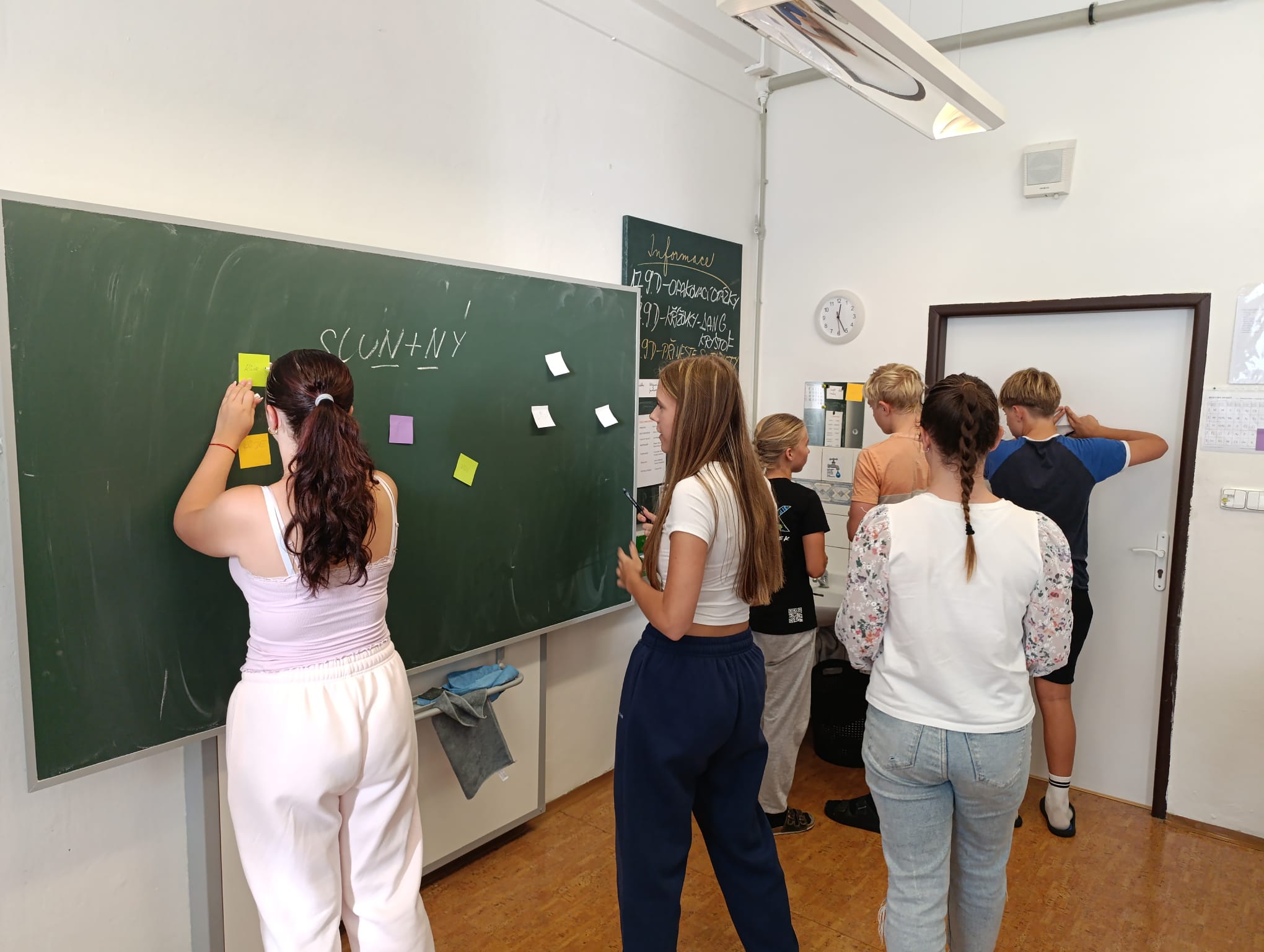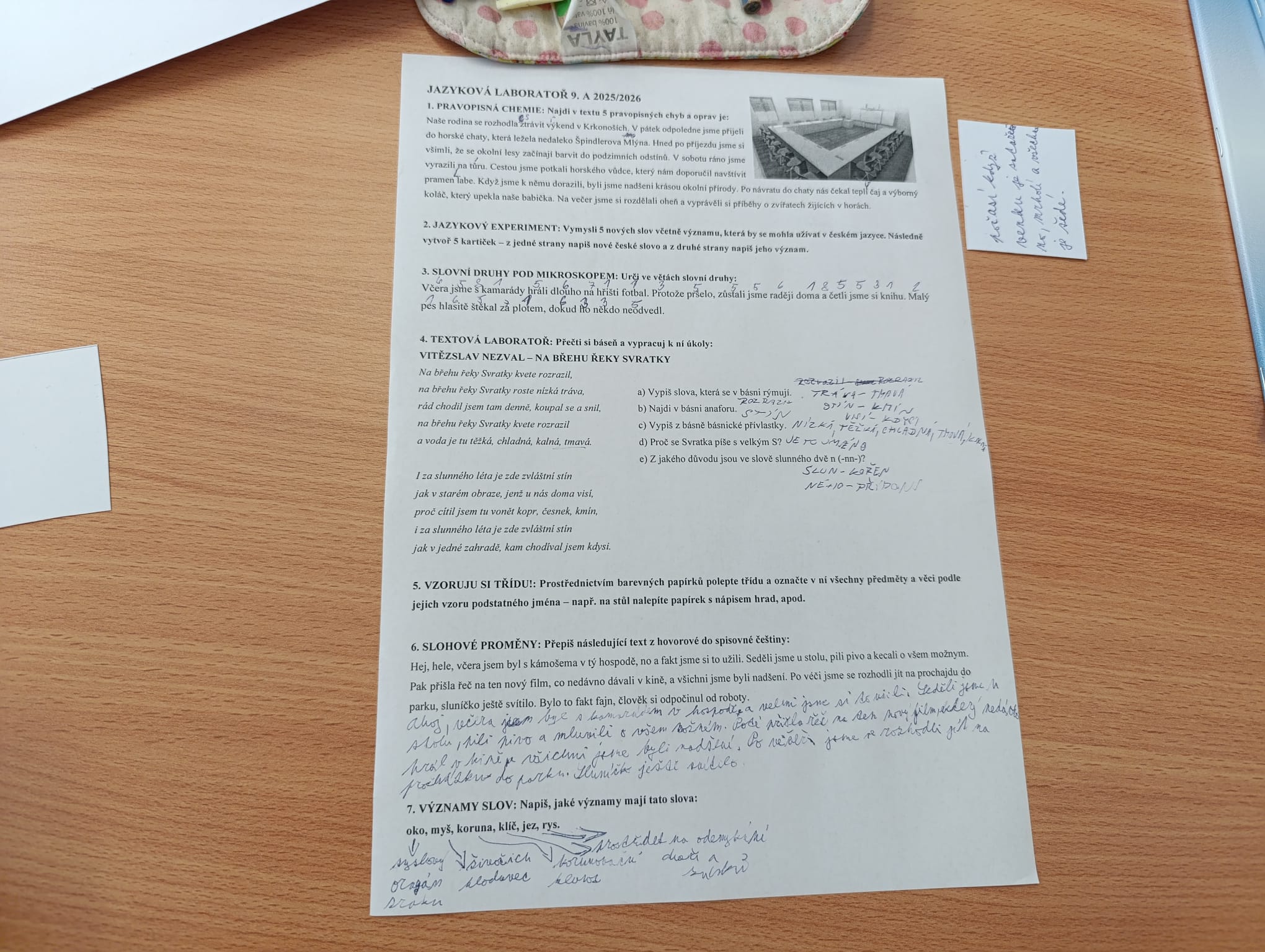 Dne 10. září se žáci 9. A v hodině českého jazyka stali součástí experimentální jazykové laboratoře. V průběhu hodiny rozvíjeli jazykový cit, přesnost a rovněž tvořivost – prostřednictvím „pravopisné chemie“ hledali chyby v textu. Při „jazykovém experimentu“ vytvářeli nová česká slova, která včetně jejich významu zaznamenávali na kartičky.
