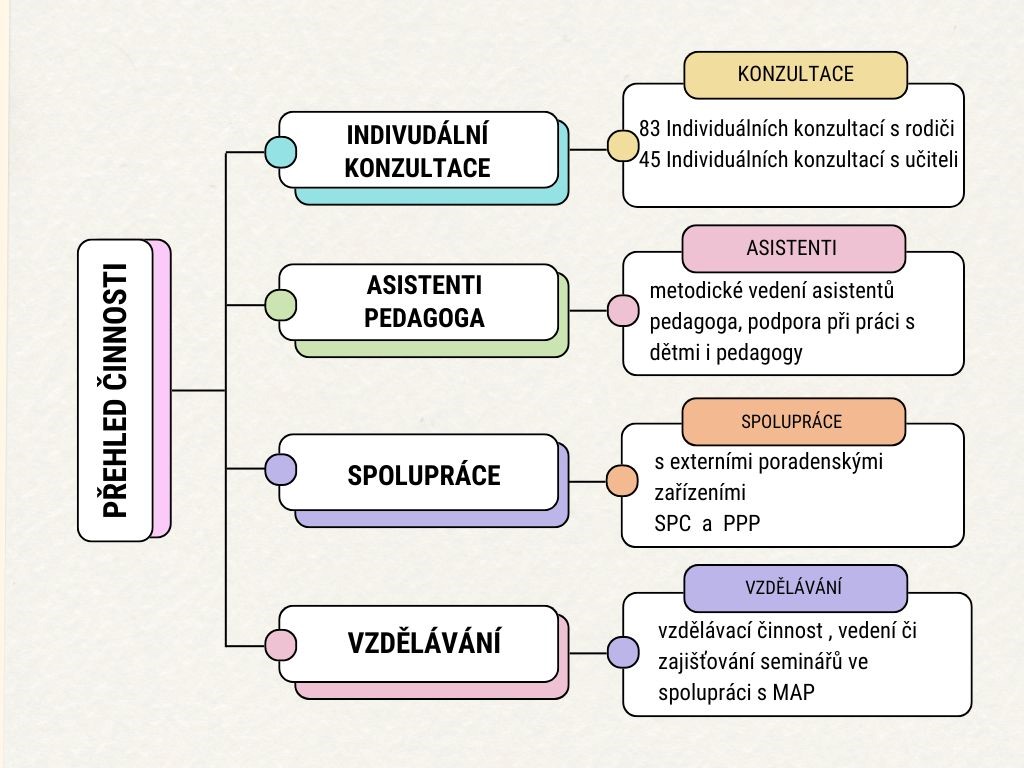 Diagnostika speciálních vzdělávacích potřeb a navrhování intervenčních kroků, v úzké spolupráci s pedagogicko-psychologickou poradnou (PPP) a speciálním pedagogickým centrem (SPC).
